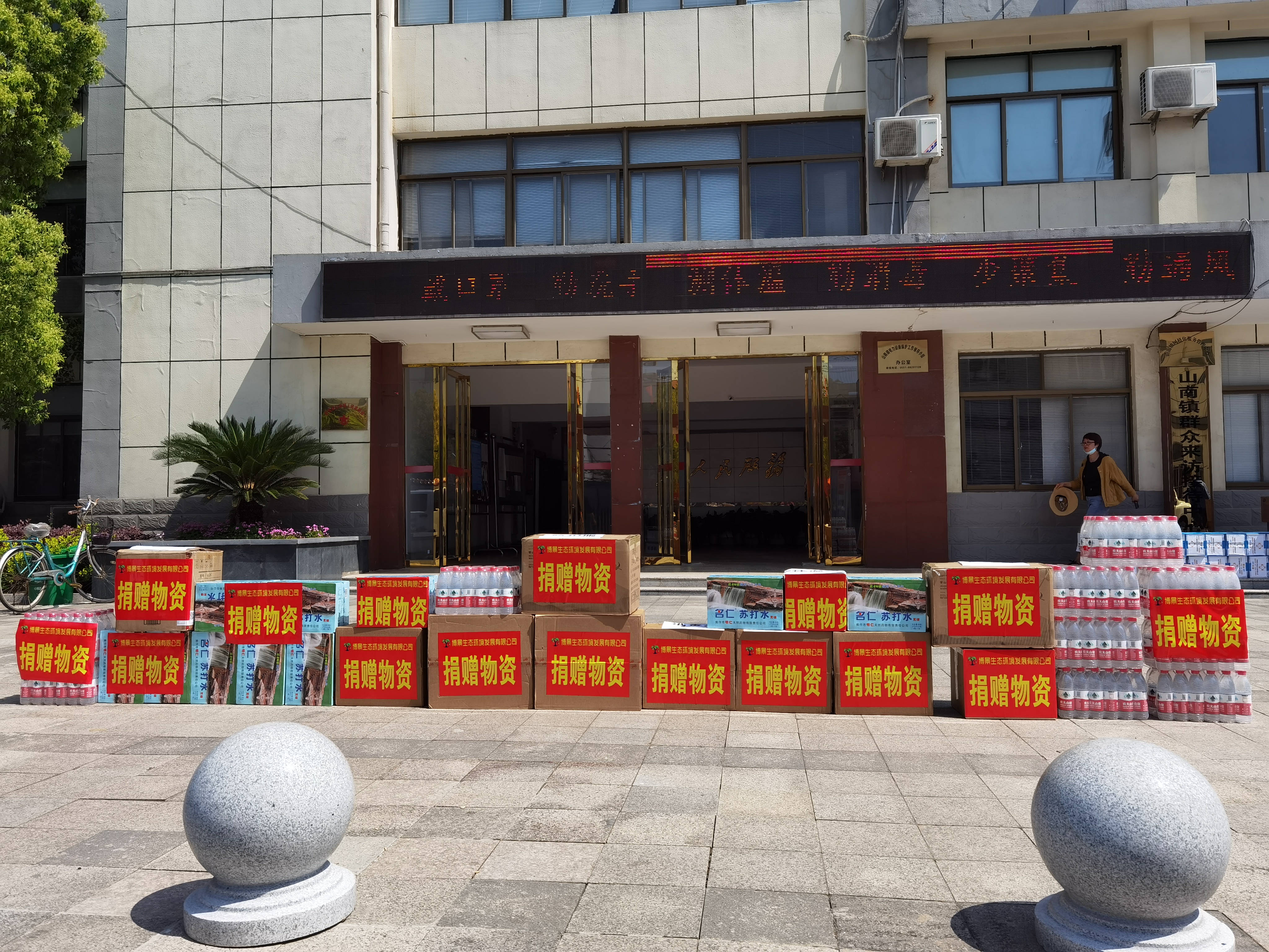 矿泉水、苏打水、医用防护服、医用口罩、消毒液、测温枪、抽纸……装满一大批抗疫物资的卡车停在了山南镇政府门口,一箱箱物资在众人手中传递,一股股暖流也在现场缓缓涌动开来,山南镇人民政府工作人员深受感动。